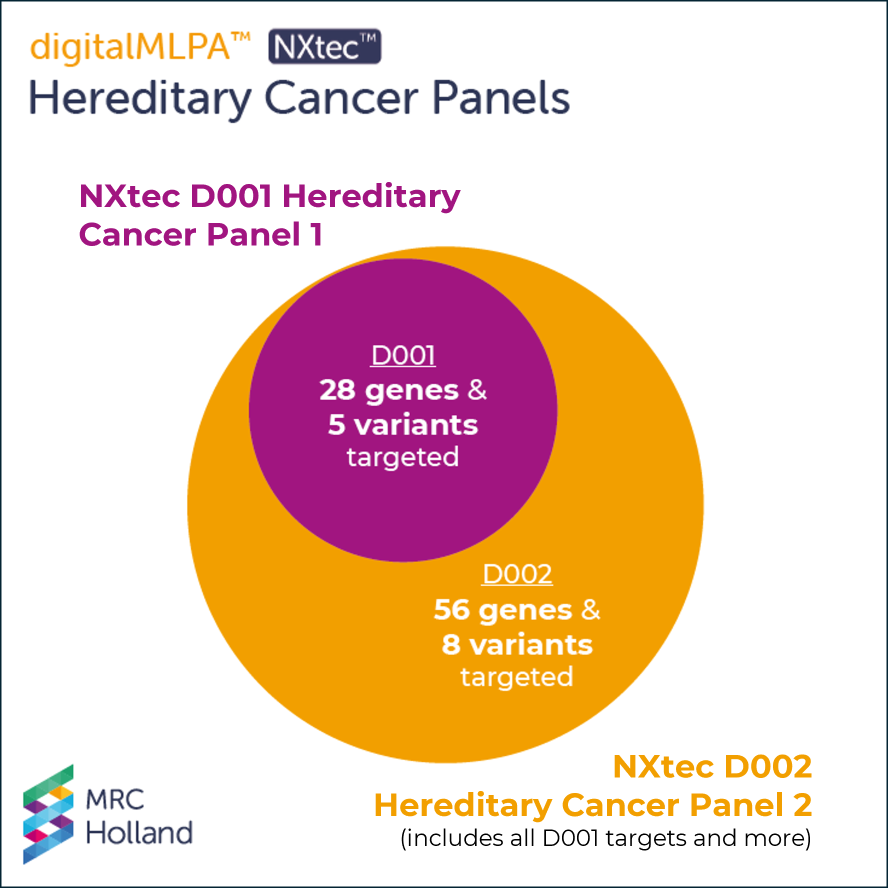 The probemix consists of 1172 probes, including 1021 probes for 56 genes associated with hereditary cancer (of which 3 probes detect the wild-type allele of mutations in PMS2, POLE and BRCA2), and 10 probes for mutations in MSH2, MITF, PMS2, FLCN, HOXB13, and CHEK2.